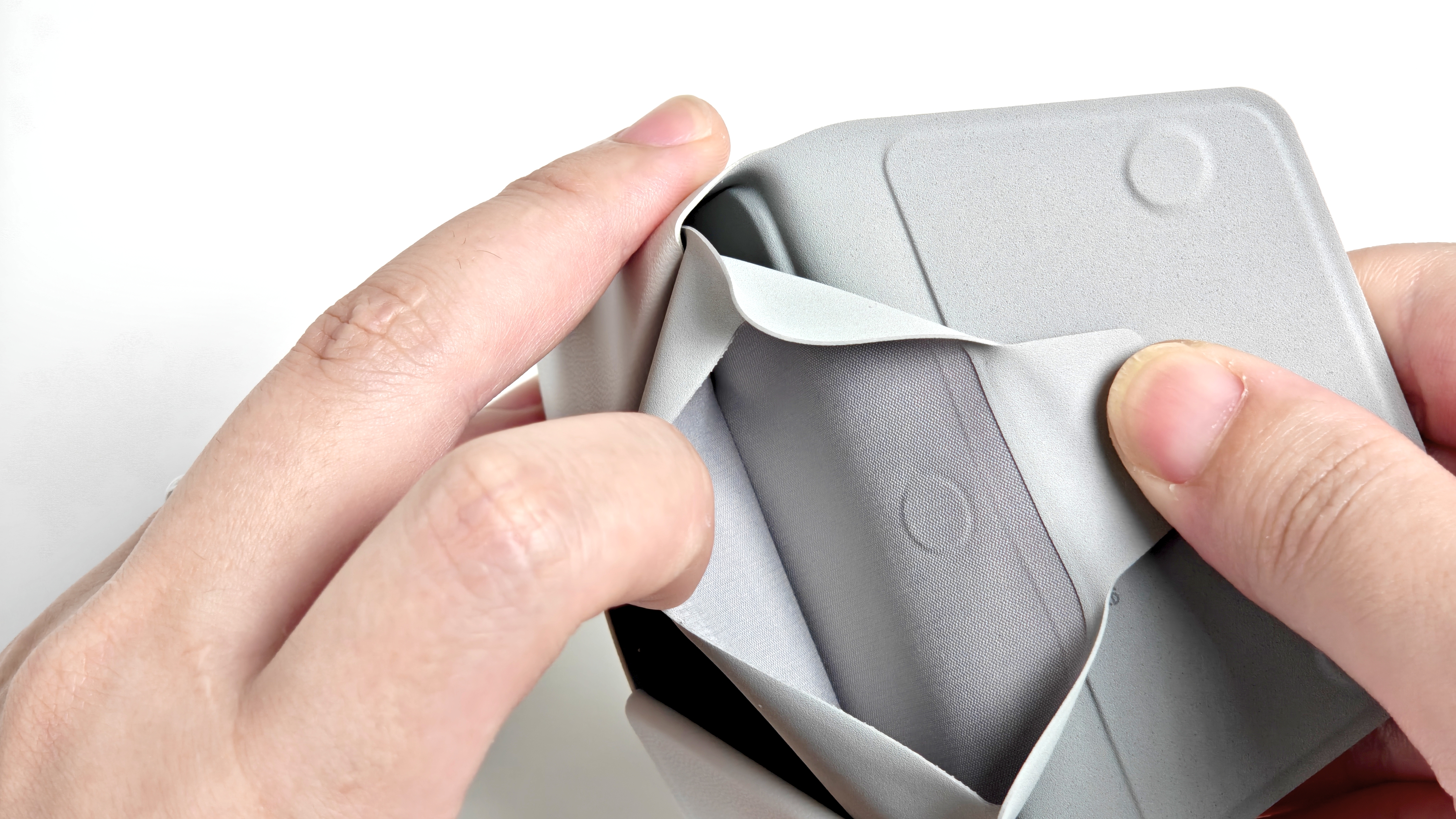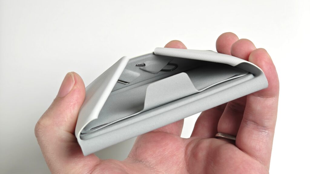 スタンド付きゆえに厚みは“ややあり”。ただ、一般的な財布よりは薄く、財布代わりに使うなら携帯性はむしろ良好だ。